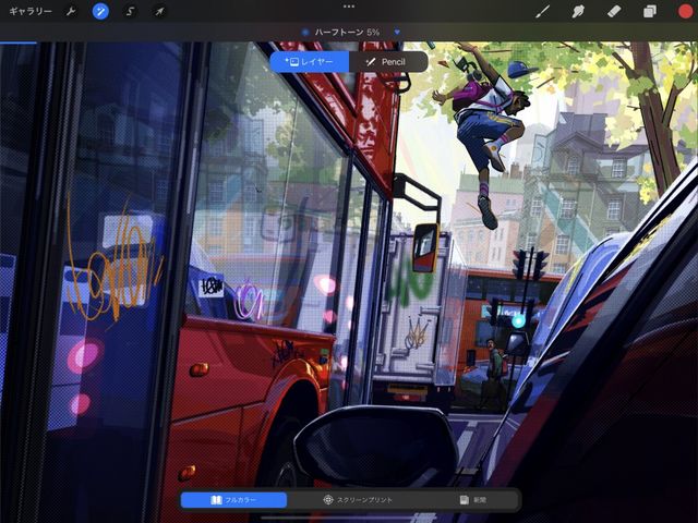 イメージや 1 つのレイヤーに複写したときのようなハーフトーンを適用して、レトロなスタイルの印刷効果を生み出します。フルカラー、スクリーンプリント、新聞の効果から選択します。