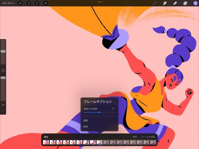 “複製” をタップすると、タイムラインで選択したフレームの横にそのフレームのコピーが作成されます。“削除” をタップすると、そのフレームが削除されます。