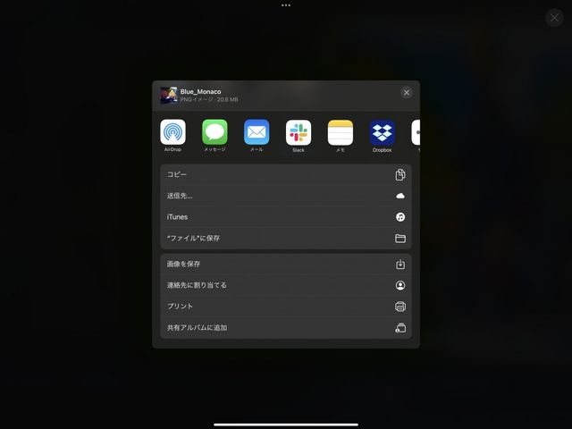 Procreate では、iOS の共有システムを使って、AirDrop や AirPrint、またはドキュメント拡張機能を提供するアプリやサービスを共有先として指定できます。