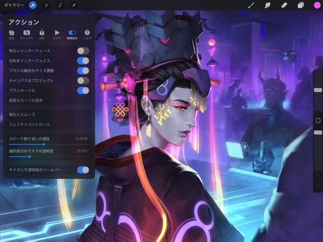 "ダークモード" を選択すると、アートワークに集中するための目立たない黒色のインターフェイスが表示されます。高コントラストの "ライトモード" は、明るい環境での作業に適しています。