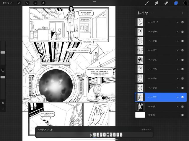 複数のレイヤーから成るアートワークが開いている状態で “ページアシスト” を有効化すると、それらのレイヤーは個々のページとなります。