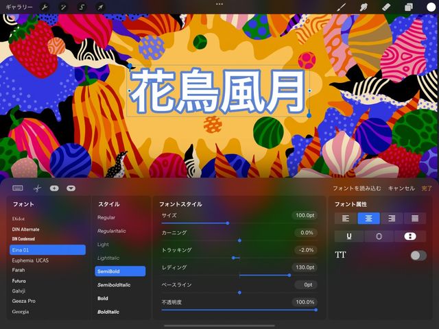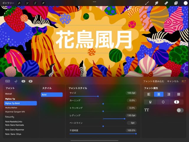 フォントは、Procreate のインターフェイスから読み込めます。AirDrop、“ファイル”、ドラッグアンドドロップ、一括読み込みでお気に入りのフォントを読み込むこともできます。