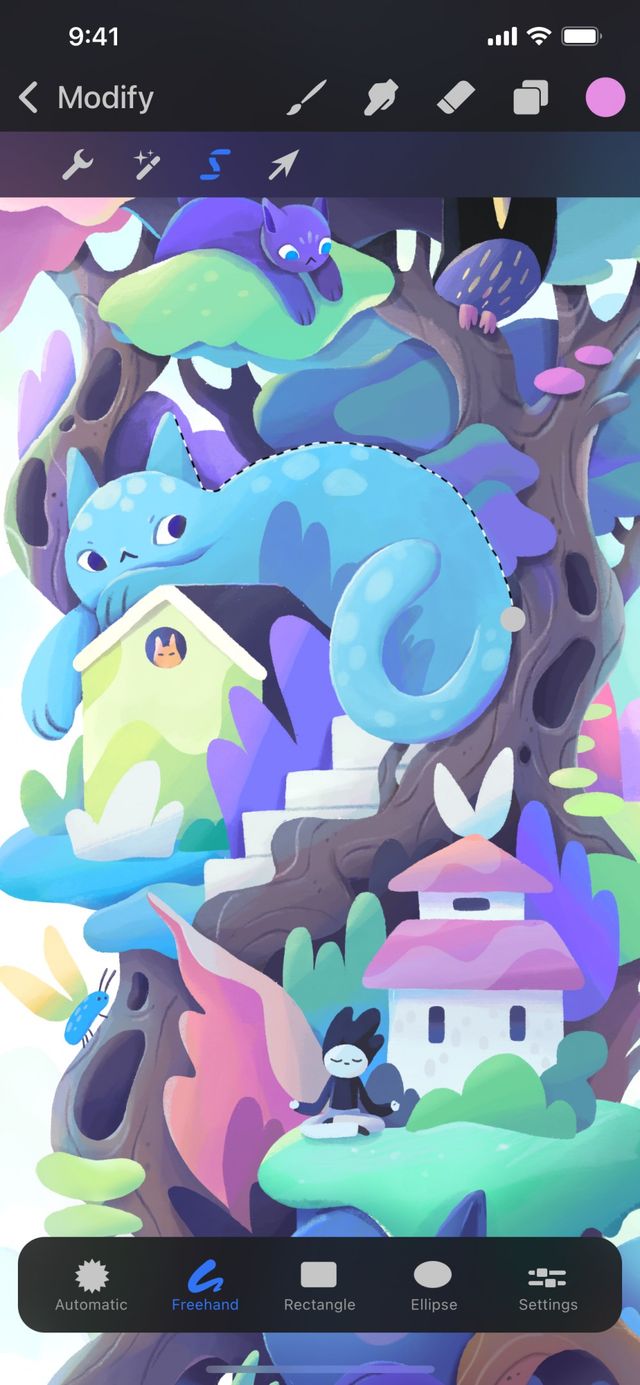 Procreate Pocket offers several ways to close your Freehand Selection depending on the action you want to take next,