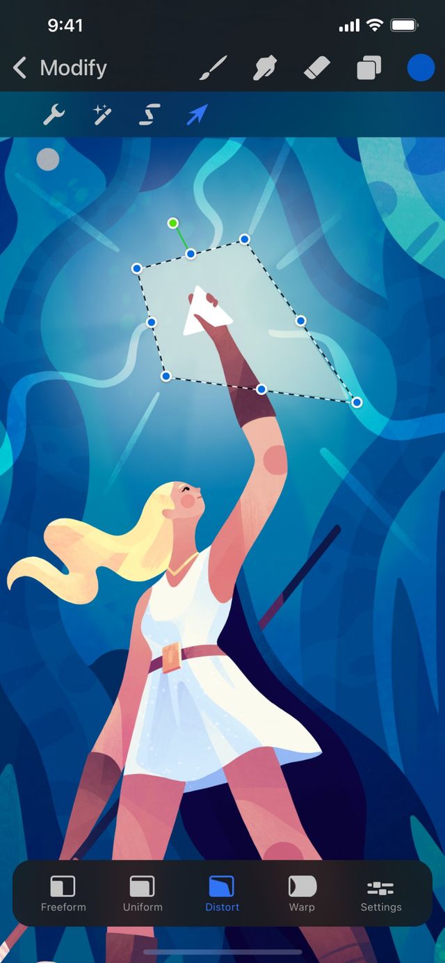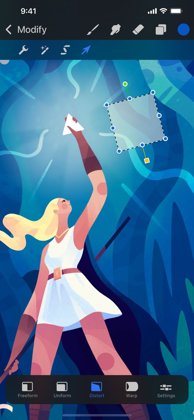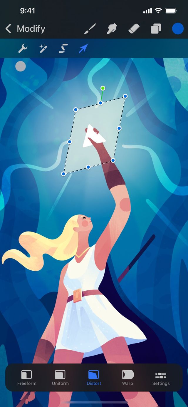You can also Distort an object from Freeform mode. Press and hold a corner node. You’ll see a Distort notification at the top of the screen. Distort mode is only active as long as you keep your finger held down. When you lift your finger, you’ll return to Freeform mode.