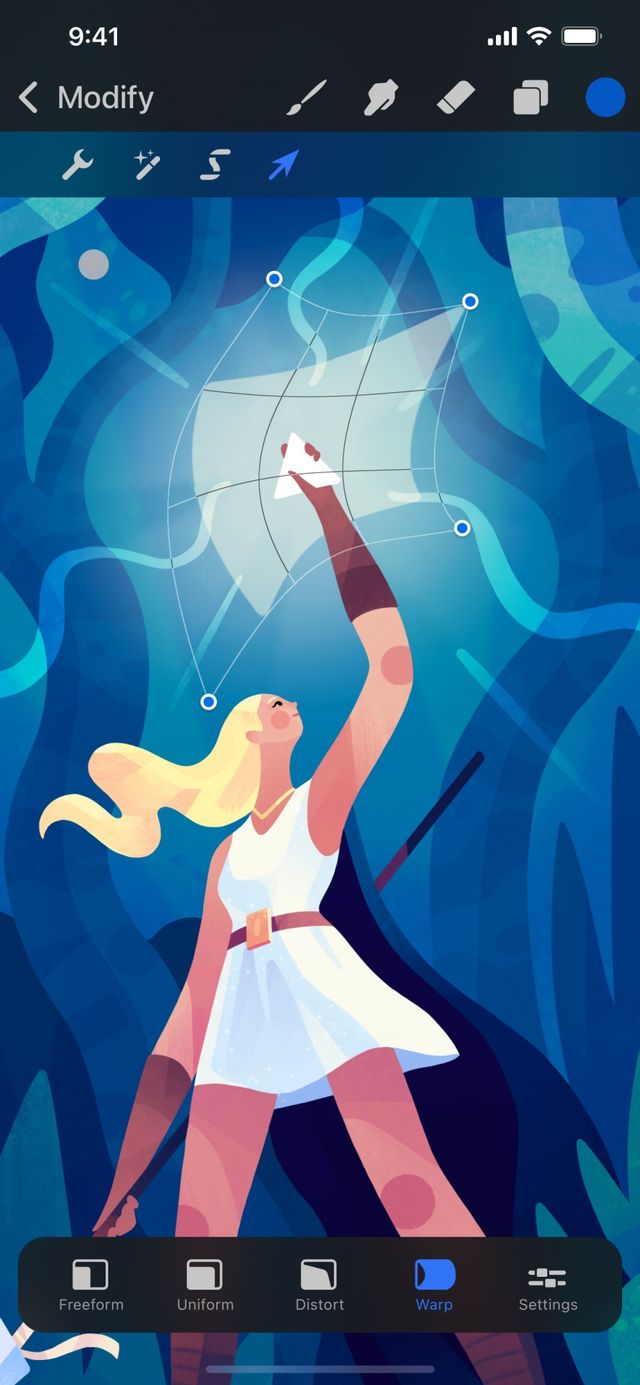 Tap the Warp button in the Transform toolbar. The bounding box in Warp mode has a solid border rather than the moving dashes of the other modes. Inside this bounding box you’ll see the Warp mesh - a grid that overlays your content like a net.