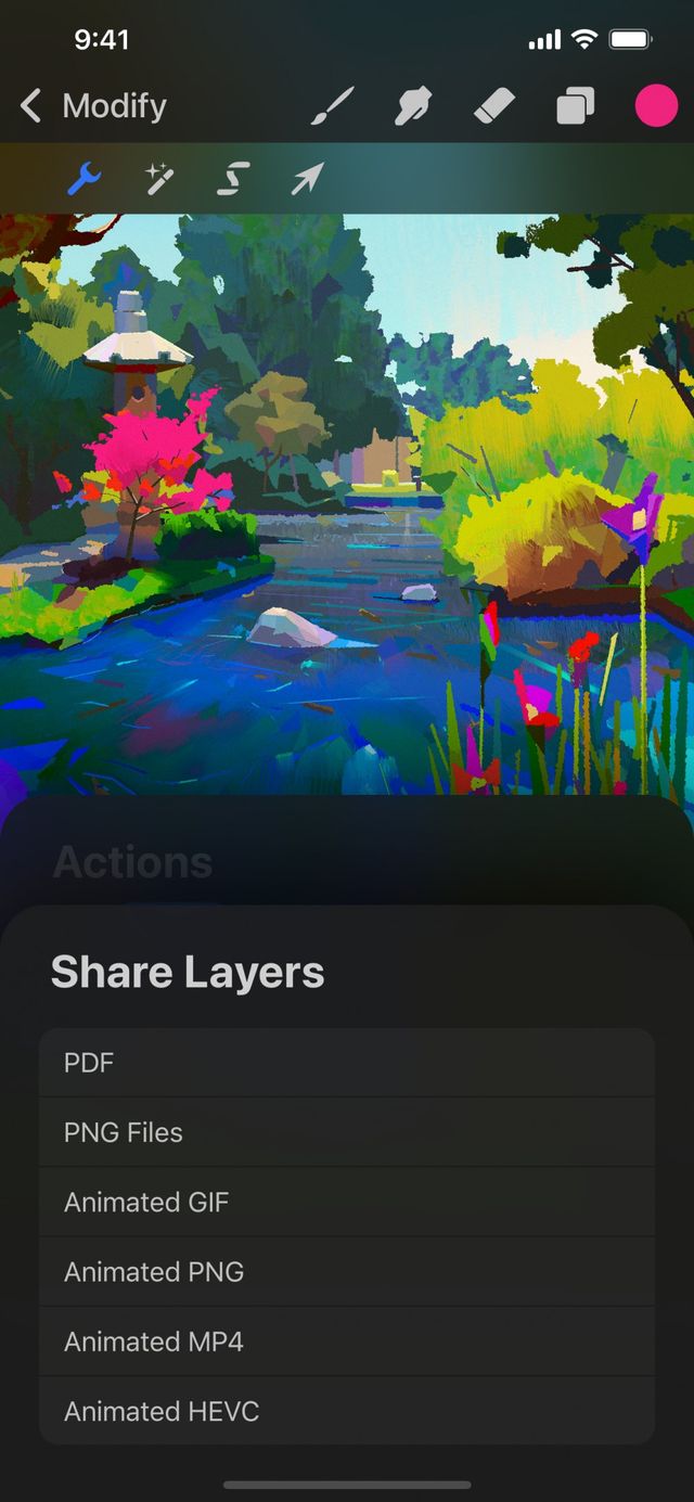 Tap Modify > Actions > Share > Share Layers. Under the Share Layers section of the Share menu, you’ll find a complete list of layer export formats. Each format uses your layers in a different way.