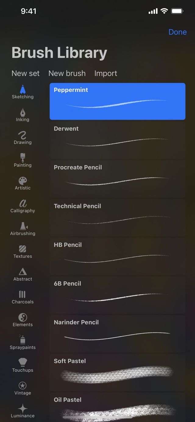 Tap New brush to create a new brush. Find and tap the Import button at the top right to import a brush from the Files app. The brush will import into your currently selected Brush Set.