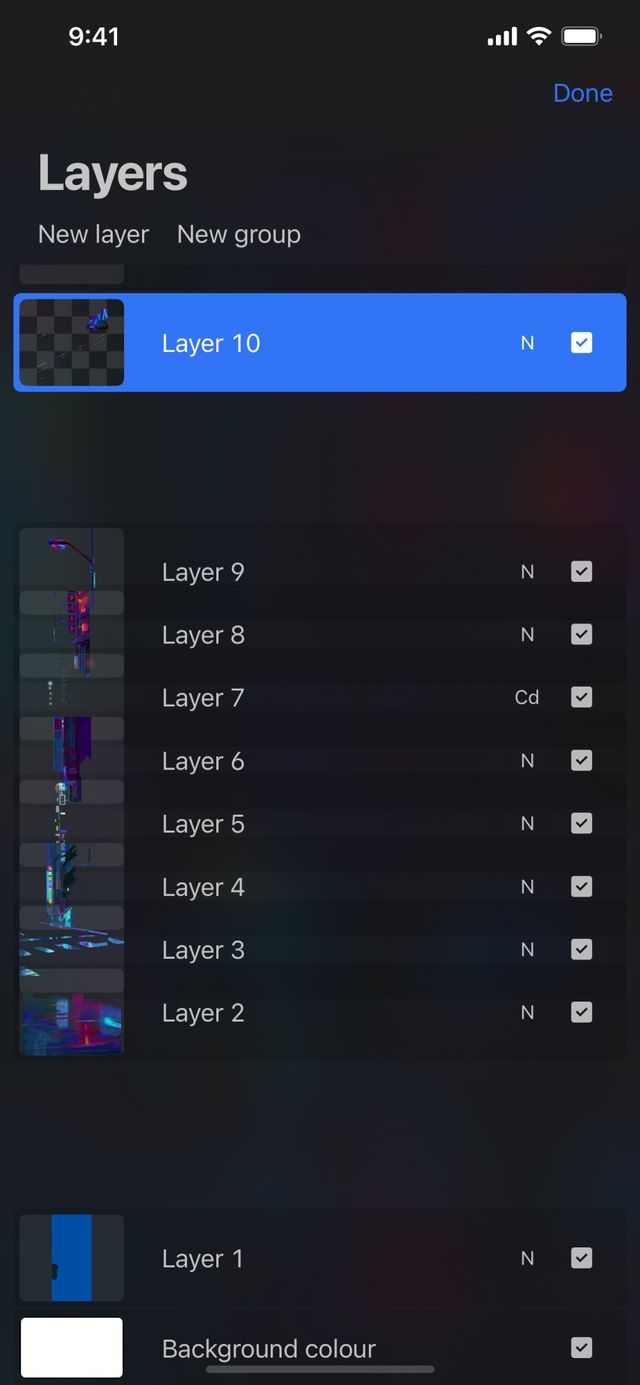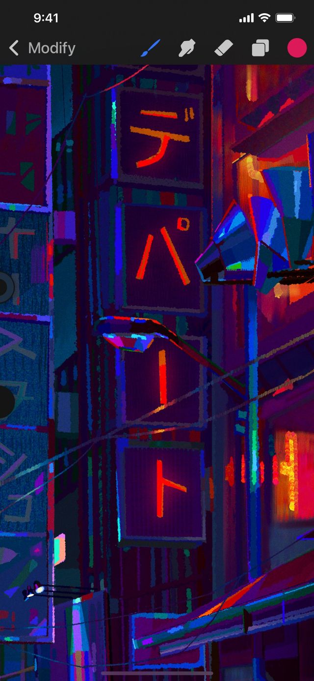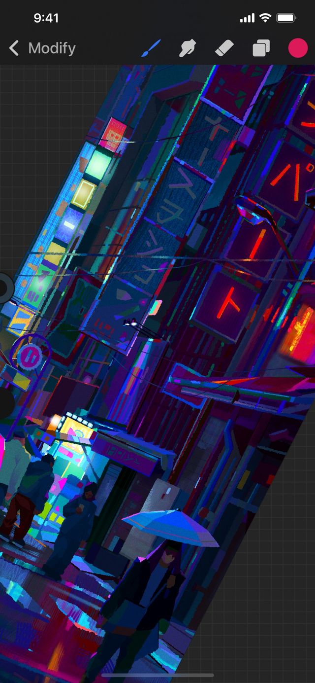 To Undo a series of actions, tap and hold two fingers on the canvas. After a moment, Procreate Pocket will rapidly step back through your most recent changes. To stop, lift your fingers off the canvas again.