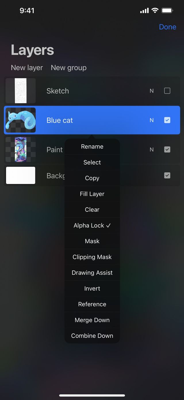 This will select any painted pixels from that layer, automatically invoking Selection mode. This will commit the selection so you can paint straight away. You’ll see areas outside the selection marked by moving diagonal lines.
