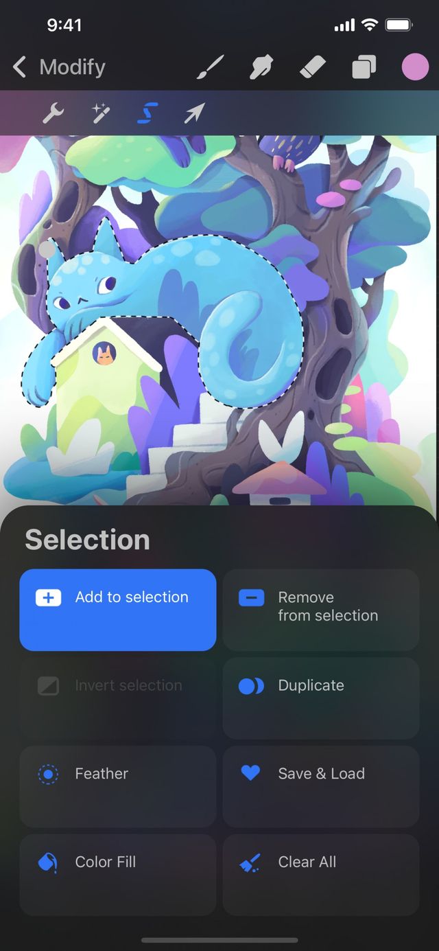 To cancel the selection you’ve made and exit back to your artwork, tap the Selection button again.