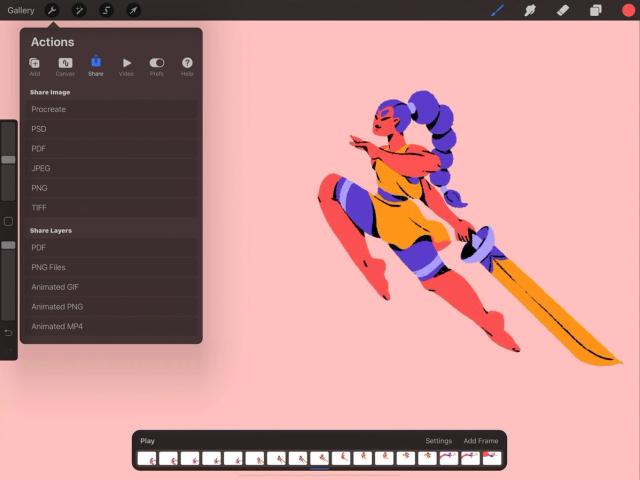 Under the Share Layers section of the Share menu, you’ll find three formats ideal for exporting animation. Each format uses your layers in a different way. Only visible layers will be exported.