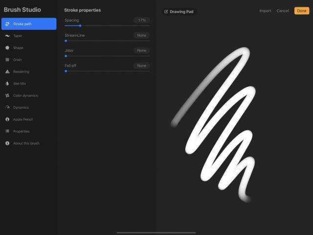 The Brush Studio is where you'll find all the settings to adjust existing brushes and create new ones. There are two ways to access it. Tap the + button at the top right of the Brush Library to begin making a new brush, or tap on your selected brush to begin editing existing settings.