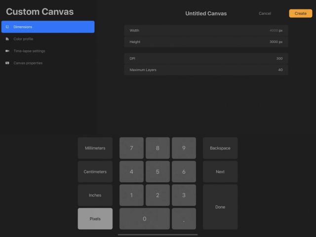 Canvas size can be set in Millimeters, Centimeters, Inches, or Pixels. You can change this unit of measurement using the buttons on the left of the keypad at the bottom of the screen.