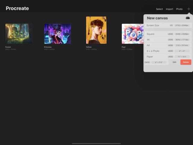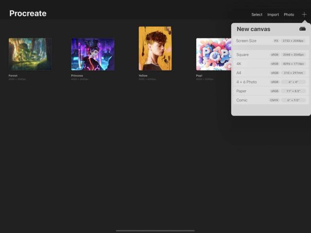 In the New canvas menu, you’ll see a list of preset canvases. These templates include Screen Size, Square, high-resolution 4K, A4 paper, 4 x 6 Photo, and US Paper.