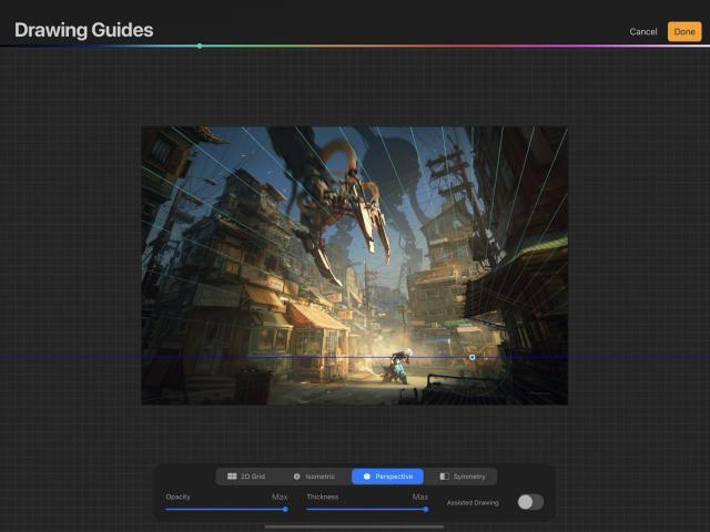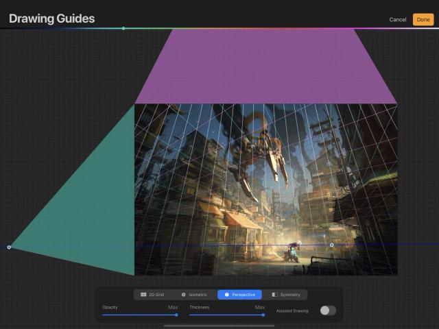Perspective Guides offer adjustable vanishing points. Use these to construct realistic objects and backgrounds in your artwork.