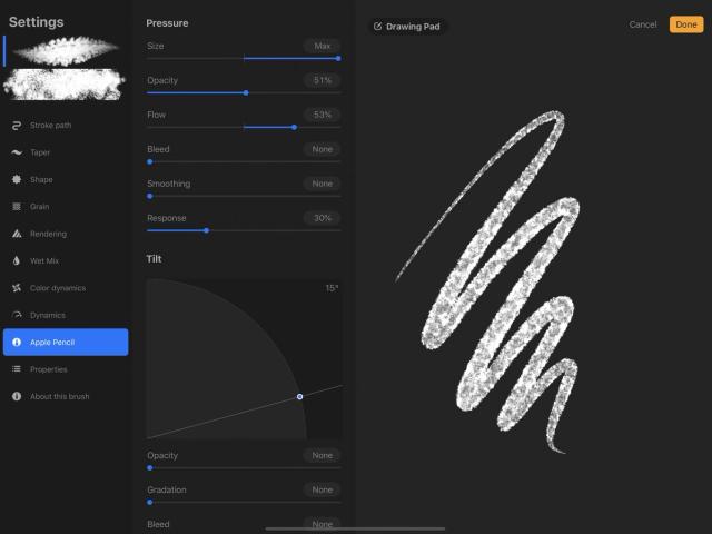 Procreate’s brushes are optimized to work natively with Apple Pencil pressure and tilt. While you can customize a wide range of brush responses to the Apple Pencil to a huge degree, you can also simply use them as-is.