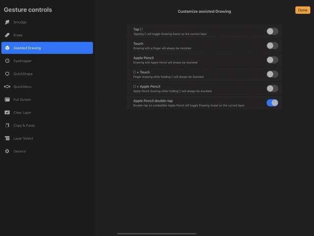 This customizable shortcut puts your favourite function at your fingertips. Change the default shortcut in the Apple Pencil section of iOS Settings, or select an option in Procreate’s Gesture Controls .