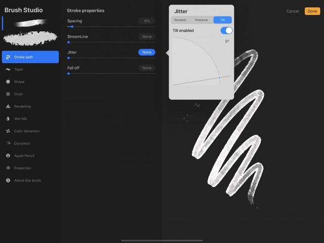 Delve into the Apple Pencil settings to adjust the fundamentals of how the Pencil uses pressure and tilt to interact with brushes.
