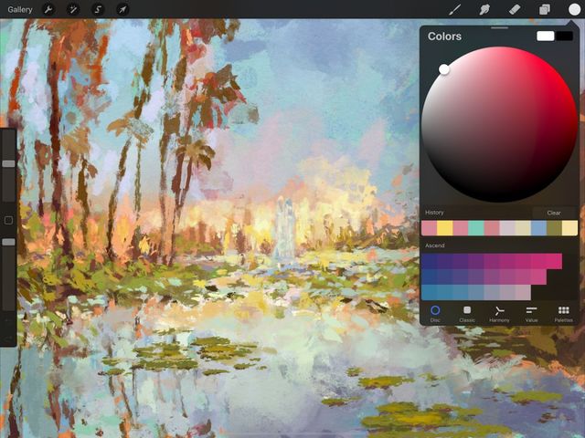Each contains a reticle: a clear circle you can slide around to set your chosen color. Choose your base color with the Hue ring. Now adjust how light, dark, or saturated it appears using the Saturation disc.