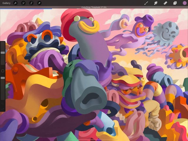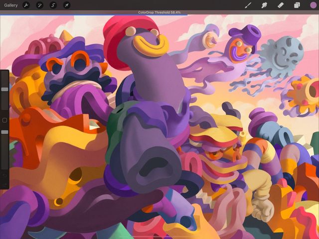 To activate Threshold, drag the Active Color over the area you want to fill, but don’t release it. After a moment, ColorDrop Threshold will activate. A thin bar above the artwork represents the threshold amount. Drag your finger to the left to fill less area, and to the right to fill more area. Lift your finger to commit the fill.