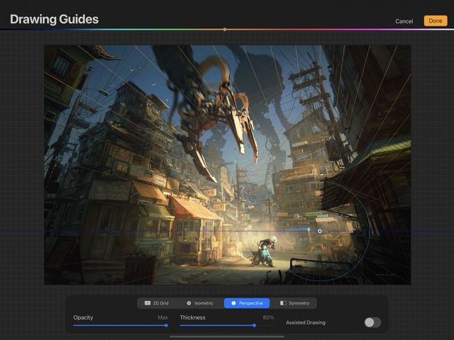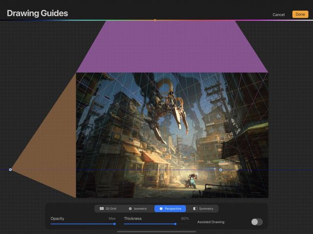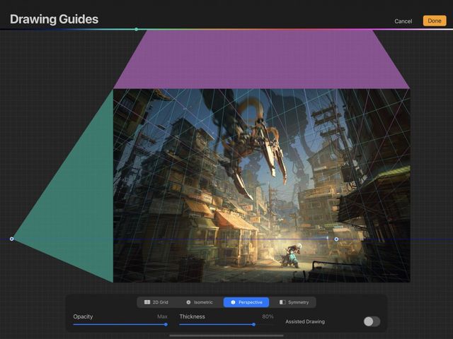 Perspective Guides offer adjustable vanishing points. Use these to construct realistic objects and backgrounds in your artwork.