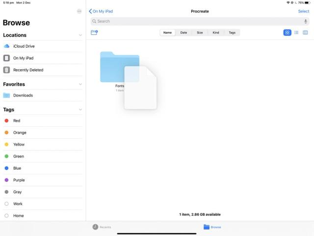 Open the iOS Files app. Navigate to your fonts folder, then tap and hold your chosen font. With another finger, tap On My iPad > Procreate > Fonts. This is where Procreate stores all imported fonts. Drop your font into this folder to install it.