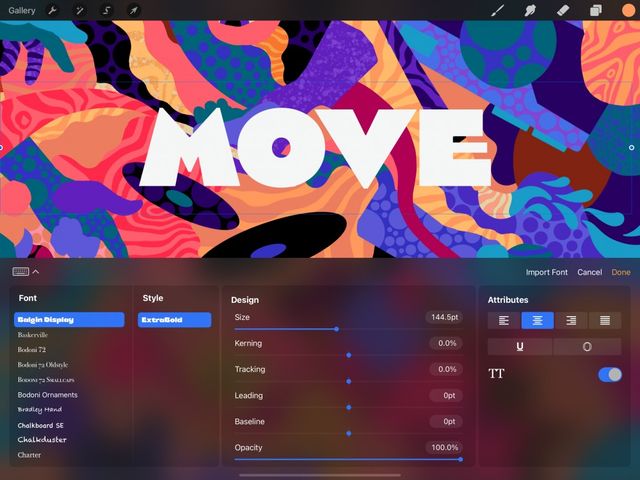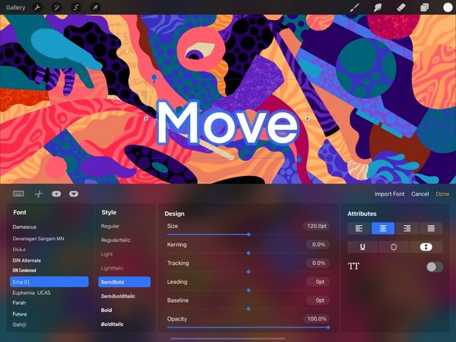 Explore the range of default Procreate fonts and iOS system fonts. Or, use your own favorite typefaces with easy import and Drag and Drop options.