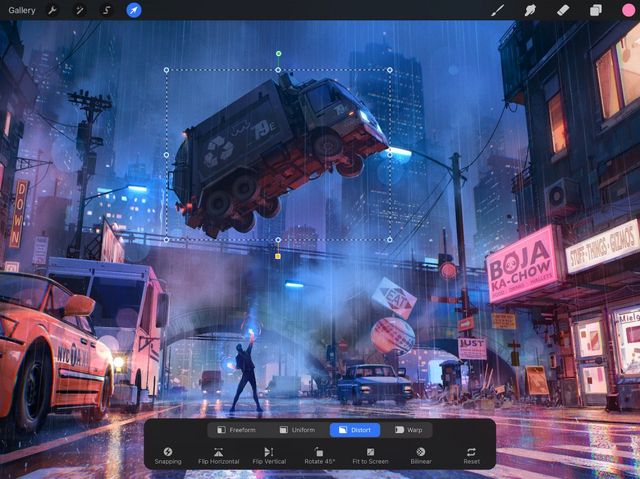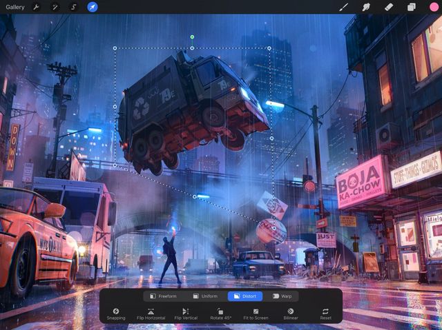 Tap the Distort button in the Transform toolbar. Drag any corner node to begin your transformation.