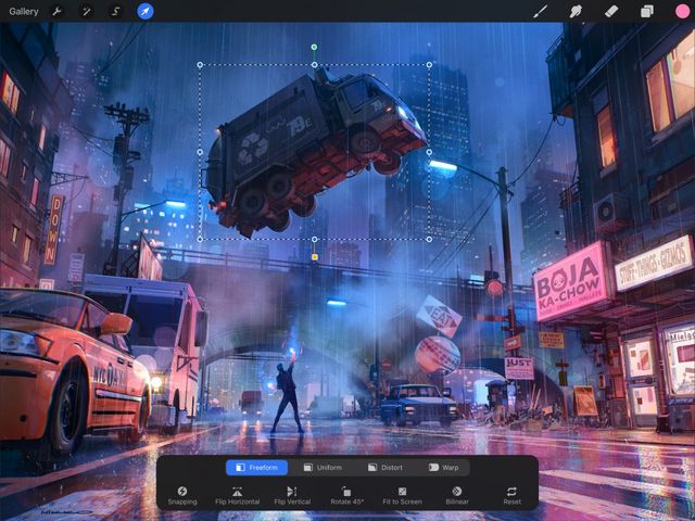 Now imagine this happening to every single pixel in a full illustration when you've got different colored pixels next to each other. Interpolation is how Procreate figures out how many more (or less) pixels it needs to give the image to make a new size or shape. And, how those pixels position so the edges between different colors in your artwork stay as clear as possible. Interpolation does all this, even when your image may have been stretched, squashed, or rotated on that grid.