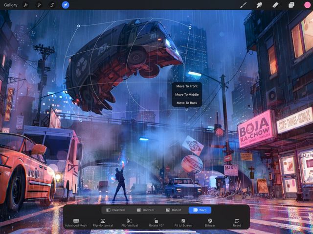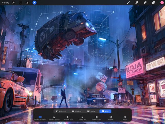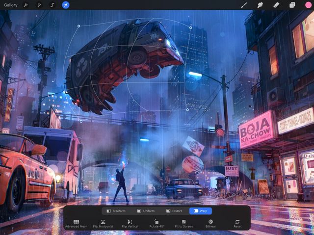 Tap the Warp button in the Transform toolbar. The bounding box in Warp mode has a solid border rather than the moving dashes of the other modes. Inside this bounding box you’ll see the Warp mesh - a grid that overlays your content like a net.