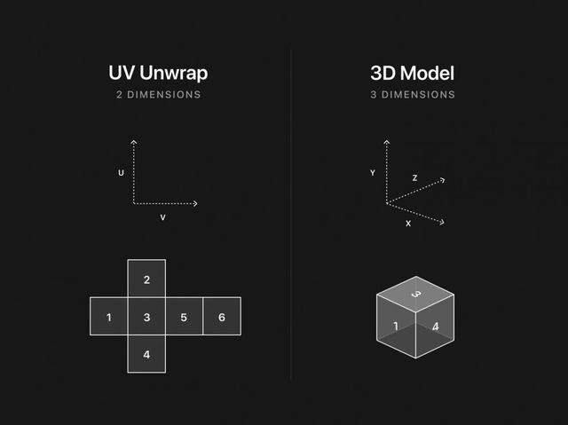 Think of a UV map as a 2D unwrapped skin that folds around your 3D model. The easiest way to visualize this is to imagine a UV map as a disassembled piece of a paper that wraps around a cube.