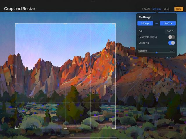 The edges of the grid overlay automatically snap to the edges, or the horizontal and vertical centre points of your canvas. This helps perform more precise cropping and resizing of your artwork or canvas.