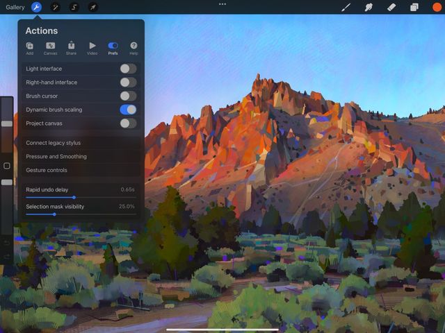 Go to Actions > Prefs to change the appearance and behavior of the Procreate interface. Do this using a series of easy-to-use toggles and sliders.