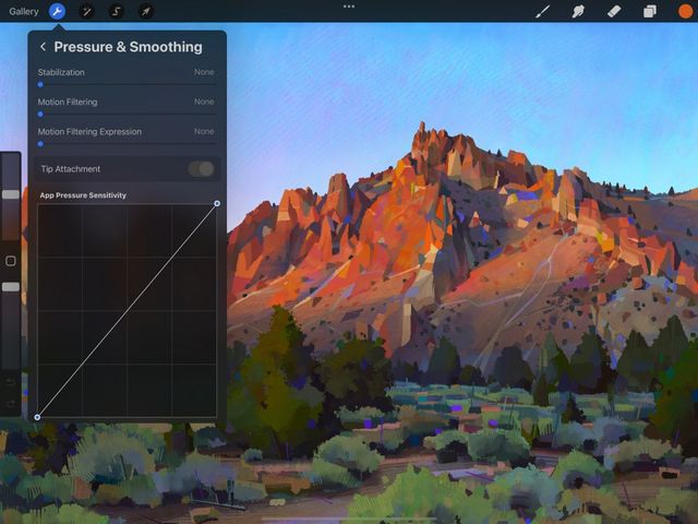 Access these settings by tapping Actions > Prefs > Pressure and Smoothing.