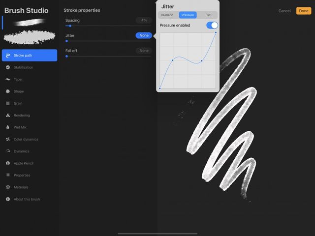 Delve into the Apple Pencil settings to adjust the fundamentals of how the Pencil uses pressure and tilt to interact with brushes.