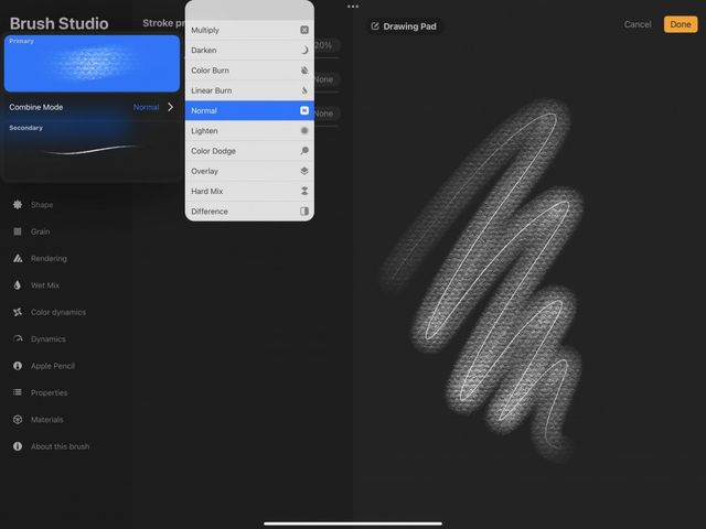 Tap your Dual Brush to enter the Brush Studio. At the top left of the Brush Studio, you’ll see a preview of the two brushes that form your Dual Brush. Tap on either one to expand the panel and reveal the Combine Mode option.