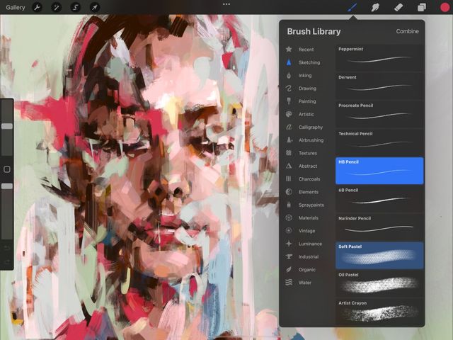 Tap the first brush to select it as Primary. When selected the Primary brush will turn bright blue. Swipe to select a Secondary brush, which will then turn dark blue. The word Combine will appear at the top right of the Brush Library. Tap this to merge the two brushes into a single new brush that has the qualities of both.