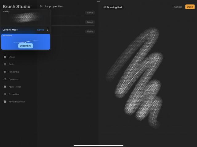 Tap your Dual Brush to enter the Brush Studio. At the top left of the Brush Studio interface, you’ll see a preview of both brushes. Tap either preview to expand the panel. Tap the Secondary Brush preview, and tap Uncombine.