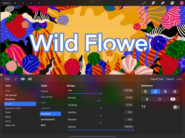 Explore the range of default Procreate fonts and iOS system fonts. Or, use your own favorite typefaces with easy import and Drag and Drop options.