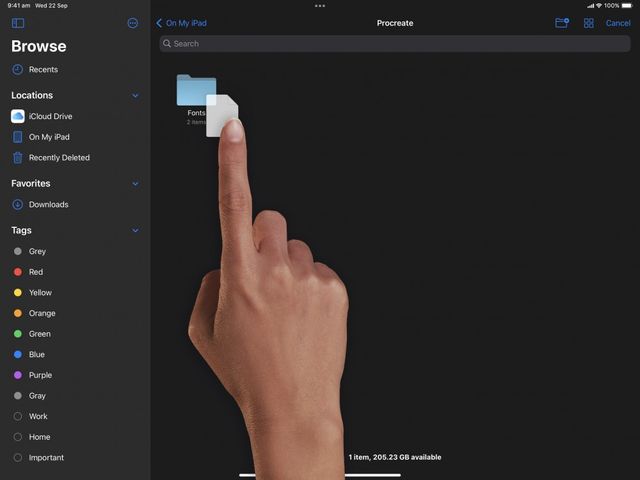 Open the iOS Files app. Navigate to your fonts folder, then tap and hold your chosen font. With another finger, tap On My iPad > Procreate > Fonts. This is where Procreate stores all imported fonts. Drop your font into this folder to install it.
