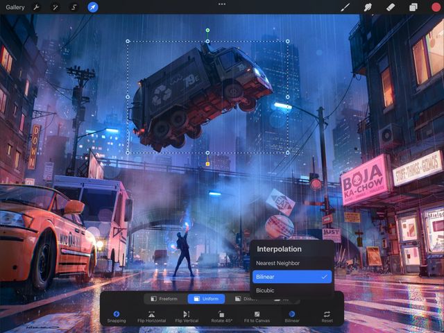Now imagine this happening to every single pixel in a full illustration when you've got different colored pixels next to each other. Interpolation is how Procreate figures out how many more (or less) pixels it needs to give the image to make a new size or shape. And, how those pixels position so the edges between different colors in your artwork stay as clear as possible. Interpolation does all this, even when your image may have been stretched, squashed, or rotated on that grid.