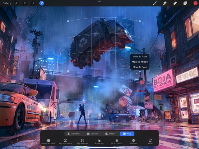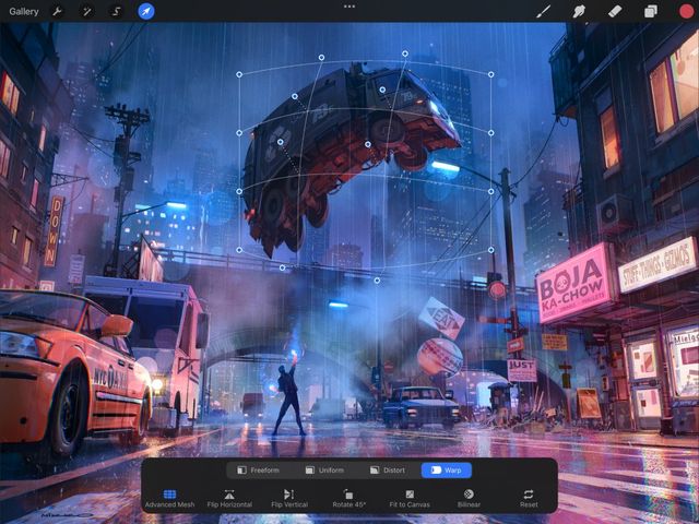 Tap the Warp button in the Transform toolbar. The bounding box in Warp mode has a solid border rather than the moving dashes of the other modes. Inside this bounding box you’ll see the Warp mesh - a grid that overlays your content like a net.