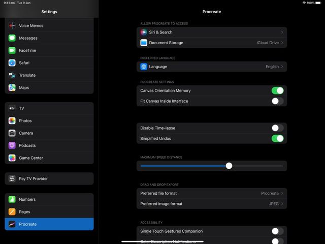 You can adjust most settings from inside Procreate. Some settings are fundamental to how Procreate’s touch responses interact with iOS. To adjust these you need to head to the iOS setting for Procreate. Tap Actions > Help > Advanced Settings to go to iOS Settings. From here you can adjust these core functions.