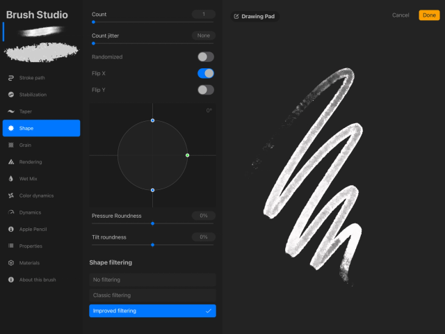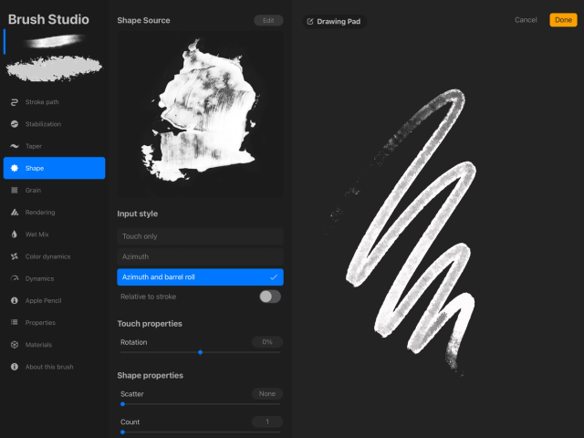 You can control your brush shape settings with input style Touch only, Azimuth, or Azimuth and barrel roll (Apple Pencil Pro required).