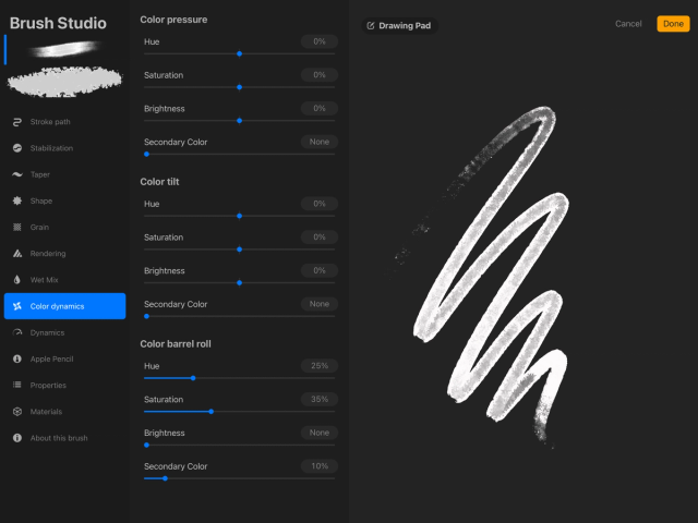 These settings are not dependent on the pressure and tilt of the Apple Pencil. For those painting with a finger, use these attributes to create more dynamic brushstrokes.