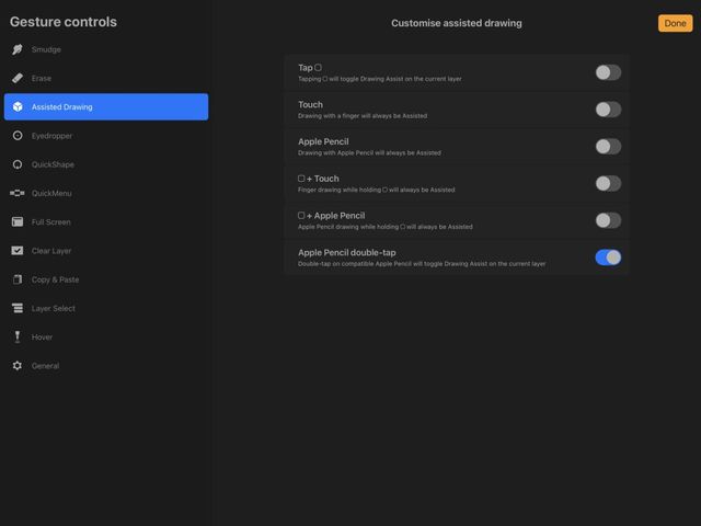 This customizable shortcut puts your favorite function at your fingertips. Change the default shortcut in the Apple Pencil section of iOS Settings. Or, select a customizable option in Procreate’s Gesture Controls .
