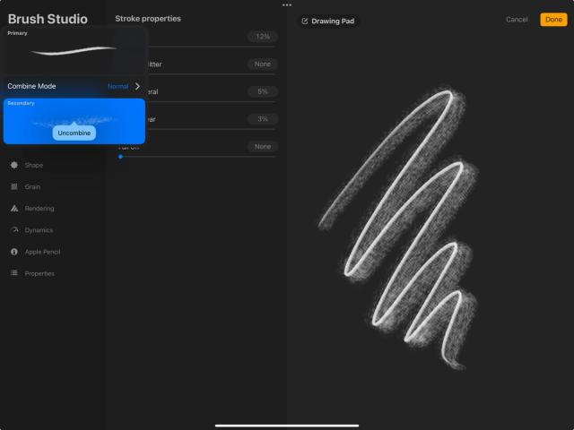 Tap your Dual Brush to enter the Brush Studio. At the top left of the Brush Studio interface, you’ll see a preview of both brushes. Tap either preview to expand the panel. Tap the Secondary Brush preview, and tap Uncombine.