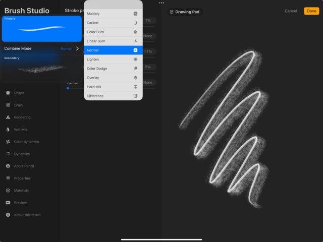 Tap your Dual Brush to enter the Brush Studio. At the top left of the Brush Studio, you’ll see a preview of the two brushes that form your Dual Brush. Tap on either one to expand the panel and reveal the Combine Mode option.