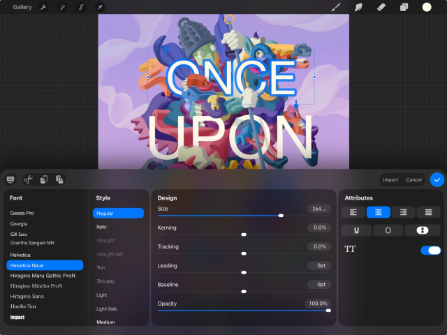 Preview fonts in real-time, adjust kerning, tracking, baseline, and other typographical settings. Make edits with a series of intuitive sliders and controls.