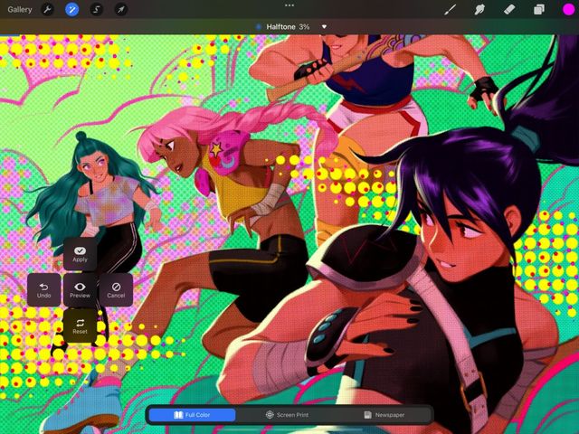 Procreate dedicates the bottom half of the Adjustments menu to Filters. Quick tools designed to create a variety of fun and punchy visual effects. Read on for an brief overview each effect. Or, explore each tool in more depth through the Handbook pages to follow.
